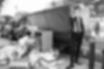 Un joven con traje y corbata fuma apoyado en un camión, rodeado de cartones, bolsas y restos urbanos.