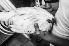 Aunque el gallo ganador ha sobrevivido, no se puede decir que haya salido ileso. Ha perdido mucha sangre y está al borde de la extenuación. Un pequeño "cirujano" lo espera con su equipo de primeros auxilios: tres bolígrafos negros, una cinta blanca, un cortador de uñas, pastillas de Nolotil para gallos, cuatro gasas y papel recortado. En menos de tres minutos, lo suturan y lo preparan para la próxima pelea, que comenzará en breve. Le queda poco para morir